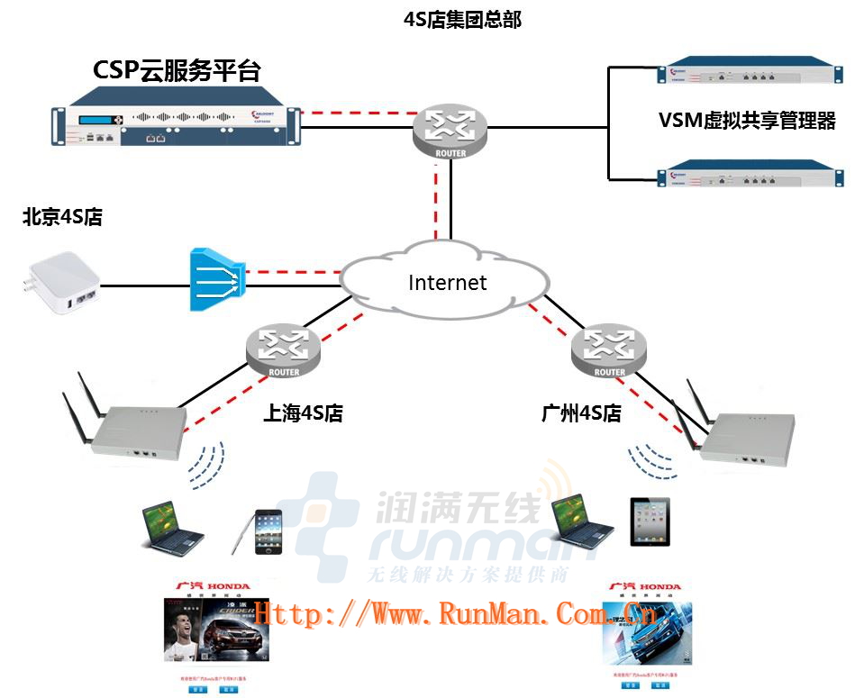 連鎖4S店全國(guó)共有500多家,共使用1臺(tái)CSP+2臺(tái)VSM+若干個(gè)VAP。其中CSP智能統(tǒng)一管理各分店的VAP,為分店簡(jiǎn)介地推送獨(dú)立的不同的廣告頁面,定向投放精準(zhǔn)營(yíng)銷。CSP集中管理各分店AP的無線策略、射頻功率、信道策略和認(rèn)證策略等。